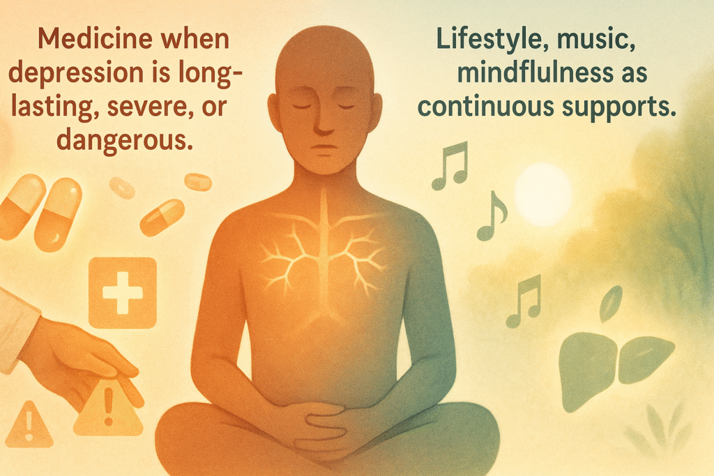 डिप्रेशन केवल दवाओ से ठीक हो जाने वाली समस्या नही है बल्कि ये सम्पूर्ण जीवन शैली के लिए एक चुनौतीपूर्ण अवस्था है , दवा केवल तब ले जब ये जरुरी हो और संगीत, अच्छा खान पान, और मानसिक शान्ति आपकी सबसे बड़ी ताकत है